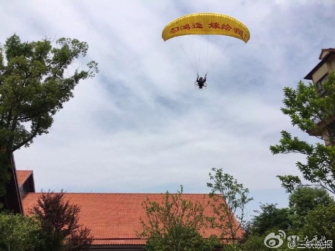 @三峡晚报【宜昌男子用开滑翔伞求婚不想被风吹挂在树上】#521表白日# 上午,宜昌一男子在龙盘湖世纪山水,乘坐滑翔伞在空中向女朋友求婚。但在低空欲降落时,因一阵强风被刮到树上。男子挂树上近1小时,最后请来吊车前来救援。辛苦下树的男子手抱花束,来到女子面前求婚。但女子没有答应转身离去……网友:天不助人,好悲剧!你觉得女子应该答应求婚吗?