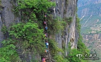 艰险上学路·悬崖上的村庄:出入走崖壁爬藤梯