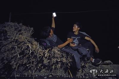 5月12日晚上,村民坐在玉米秆上搜寻手机信号,村里没有发射塔,全靠山下发射到的微弱信号接收手机短信和打电话。