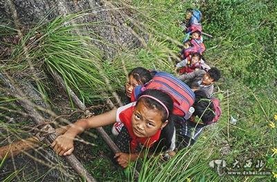 上学的孩子都背着沉沉的书包,大多数是女孩,15个孩子在三个家长的保护下,大约用了2个小时,到达“悬崖村”。