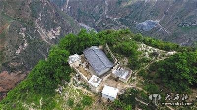 5月13日,无人机俯瞰位于悬崖边缘的村民某色拉则的家,他家的后院门推开就是悬崖,房屋所在位置也是全村最高点。