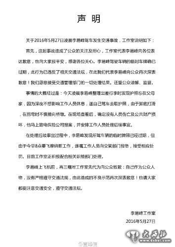 声明称,李易峰驾驶车辆的临时车牌确已过期,此行为已违反了相关交通法规,在此我们代表李易峰向公众再次深表歉意,并愿意接受交通管理部门的一切处理结果。