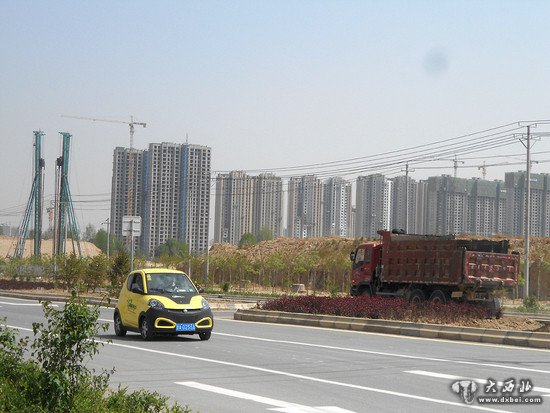 在兰州新区马路上看去,远处满满的都是房子