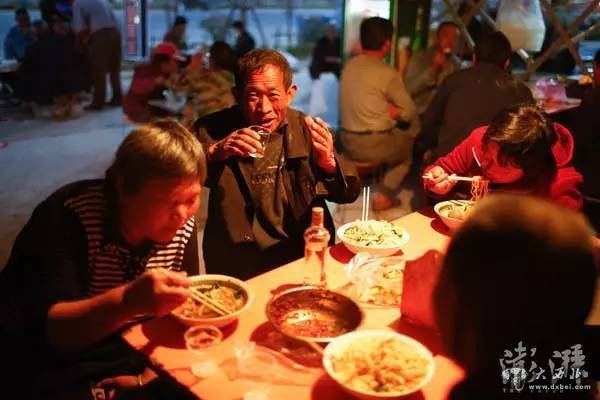 5月15日,傍晚,结束一天的工作后,劳工们在一家客栈门口吃晚饭。