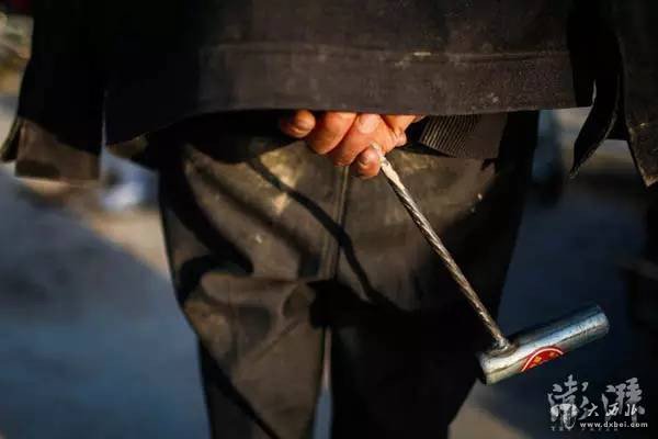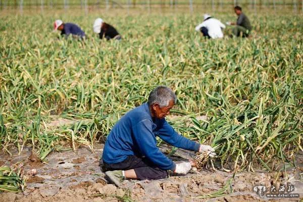 一名劳工拿着挖蒜的工具。大蒜的种植和收货目前机械化程度较低,基本都需要靠人力完成,劳动强度很大。