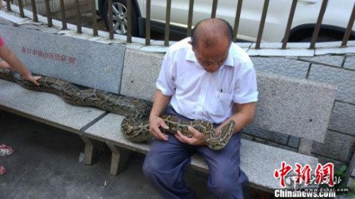 中新网海口6月1日电(记者 李宇凡)现年68岁的海口市民施继民,7年前从小区门口卖鱼小贩手中拯救一条即将被丢弃的小蟒蛇,收养在家。如今,这条小蟒蛇长成为一个长3.7米、重60公斤的“大块头”。而施继民与小蟒蛇之间情如“亲人”的故事,在当地传为佳话。