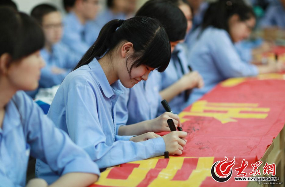 6月4日,山东省实验中学高三14班的教室内,一名学生在黑板上写下“梦从此启航”的标语。