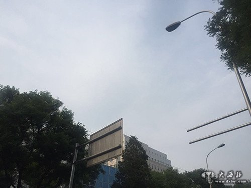 通过记者拍摄照片对比可看出,5月3日所拍照片能够明显看到大楼标牌和路牌,今日所拍照片两个牌子均已不见,只能看到路牌架子还悬在马路中央。