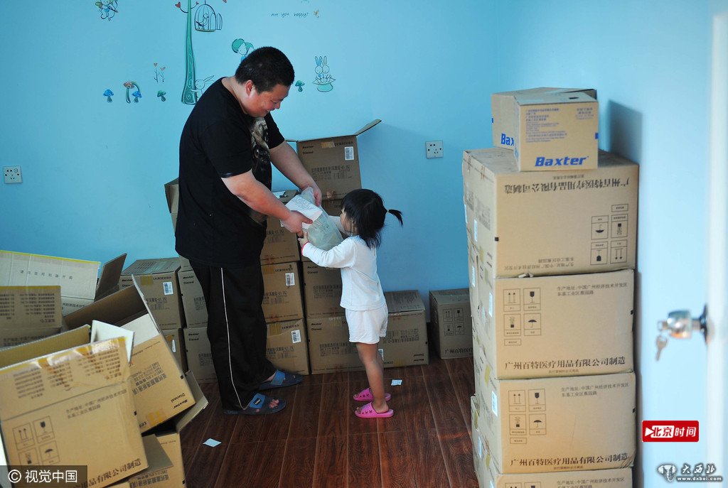 一个月要用的药需要一个专门的房间存放,每次丈夫买药回家,需要一辆面包车装满满一车的药品,而这一车药只够用一个月。为了多赚点钱,江亮打着三份工,白天帮人拉货、看店,晚上去做检疫员,一个月三四千元收入,勉强维持妻子的日常治疗。