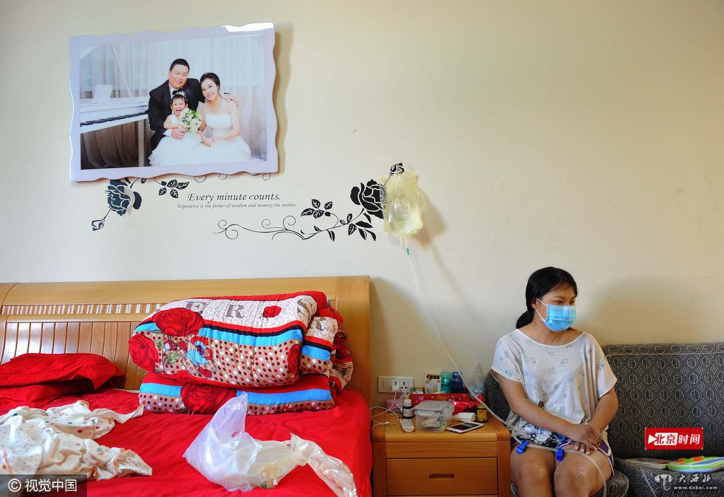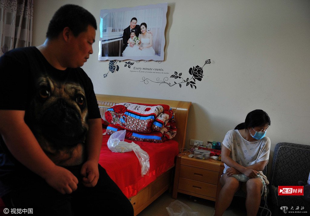 6月5日,浙江金华,在兰溪游埠镇伍家圩村一间普通民房里,31岁的廖艳正在丈夫协助下做腹膜透析。她是一位尿毒症患者。在上海大医院治疗花费了五十多万元后,只能回到家里,自助做腹透以维持生命。