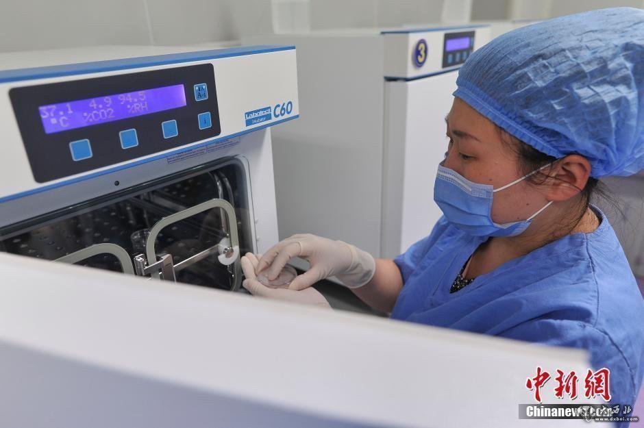 图为医生将装有精子与卵子的培养皿放入培养箱,培养箱温度约37摄氏度,模拟人体宫腔环境。