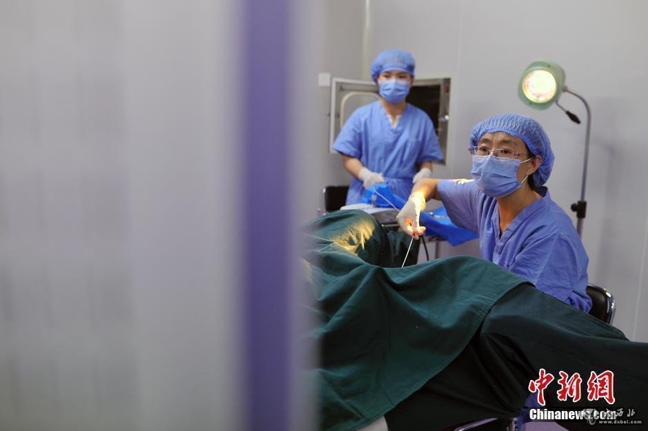 6月8日,山西省太原市,记者跟随医生探访山西省人口计生委科学研究所,观看了“试管婴儿”技术的全过程。随着二孩政策的开放,“试管婴儿”成为年纪偏大人群实现生育的一种方式。图为主刀医生张凤敏手持取卵针为待孕女性取卵。