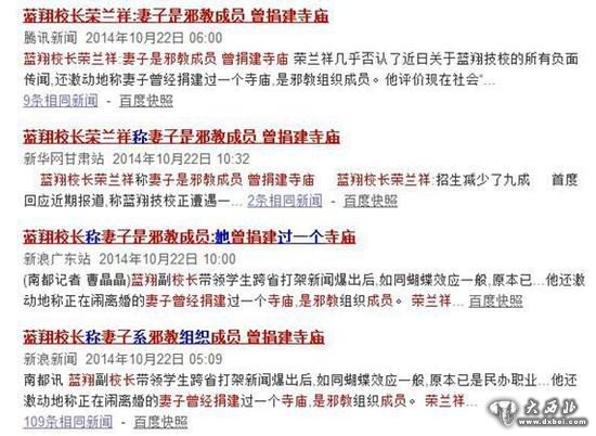 记者了解到,2014年10月22日,某报纸发表“蓝翔校长荣兰祥:招生减少了九成首度回应近期报道,称蓝翔技校正遭遇一场危机”一文,载明了荣兰祥接受该报记者采访的经过,其中有“但荣兰祥又无意中提到了搞教育是国家的,不是我个人的,不是家庭的,不能继承。他还激动地称正在闹离婚的妻子曾经捐建过一个寺庙,是邪教组织成员。”该文中还配发了荣兰祥在学校实习车间门口的照片。文章发表后,部分网站在首页以“蓝翔校长荣兰祥受访:妻子是邪教成员曾捐建寺庙”为题转发该文。