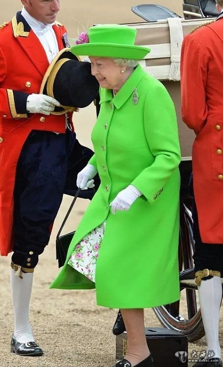 在自己90大寿这天,女王大大挑了一件荧光绿的大衣,帽子也是配套的荧光绿.....
