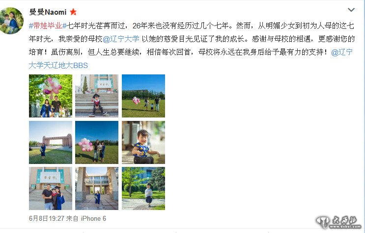 小徐在博文中说:“七年时光荏苒而过,26年来也没有经历过几个七年。然而,从明媚少女到初为人母的这七年时光,我亲爱的母校@辽宁大学以她的慈爱目光见证了我的成长。感谢与母校的相遇,更感谢您的培育!虽伤离别,但人生总要继续,相信每次回首,母校将永远在我身后给予最有力的支持!”