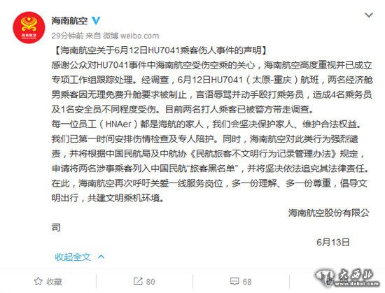 中新网6月13日电 据海南航空股份有限公司官方微博消息,对于海南航空空乘被打事件的,海南航空高度重视并已成立专项工作组跟踪处理。经调查,6月12日HU7041(太原-重庆)航班,两名经济舱男乘客因无理免费升舱要求被制止,言语辱骂并动手殴打乘务员,造成4名乘务员及1名安全员不同程度受伤。目前两名打人乘客已被警方带走调查。