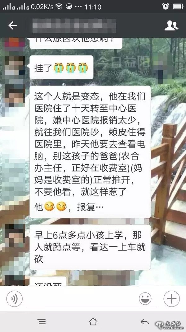 “益阳那些事”爆料,6月13日6时许,益阳市赫山区岳家桥卫生院一医护人员的小孩上学途中被患者砍伤。