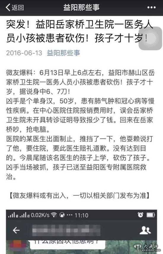 6月13日,湖南益阳市岳家桥卫生院一名医护人员的小孩上学途中被患者砍伤。