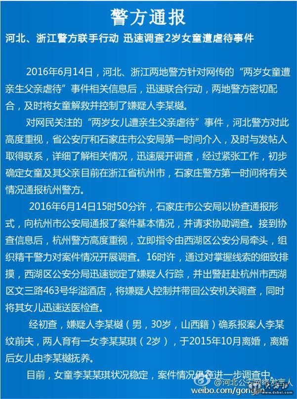杭州市公安局官方微博@平安杭州 6月14日发布关于浙江、河北警方联手行动迅速调查2岁女童遭虐待事件。