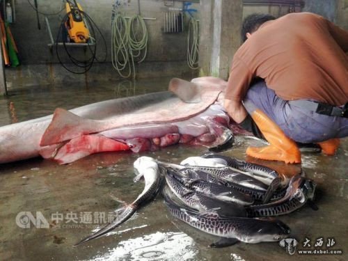 台东长滨定置渔网连续闯入2只虎鲨,先后剖腹取出75只幼鲨,首批38只幼鲨,生命力旺盛已能进食,水试所分析,最近可能是虎鲨繁殖期。图为给鲨鱼跑妇产。