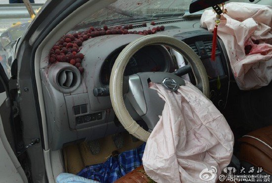 男子疲劳驾驶出车祸 瞬间喷出杨梅汁吓坏网友
