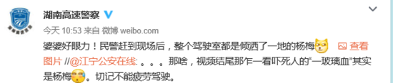 看到受到惊吓的网友评论后,湖南的交警蜀黍们坐不住了,他们随后在微博上回复网友称:“民警赶到现场后,整个驾驶室都是倾洒了一地的杨梅!”