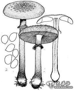 形态特征:子实体较大,黄色。菌盖直径5-10cm,幼时扁半球形,后渐平展,中部稍凸起,橙黄色或稍浅,湿时粘,具黄色至黄白色鳞片且易脱落。盖边缘具不太明显的短条纹。菌肉较薄,白色至淡黄色。菌褶离生,乳白色至淡黄色,较密,稍宽,不等长。菌柄圆柱形,长5-10cm,粗0.8-1cm,基部膨大近球形至棍棒状,内部松软至空心,白色至淡黄色,菌环生柄之上部,膜质,薄。菌托成粉粒或棉绒状除附在盖顶部成鳞片外,也附着在柄基部呈现出明显的黄色粉末状菌托残迹。往往柄上也附着黄色粉末。孢子白色,光滑,卵圆形,8-10.7μm×5-7.6μm,糊性反应。