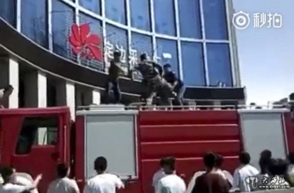 网传视频显示:办公楼门前,至少有6人在疑似消防车顶打斗;消防水枪被打开,水柱冲击聚集者;一女子跪在一躺地男子旁哭泣。