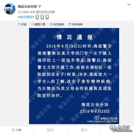 中新网6月20日电 据北京市海淀公安分局官方微博消息,19日21时许,北京市海淀警方接报警称在某大学西门有一女子被人强行拉上一面包车带走。接警后,海淀警方立即展开工作,连夜在朝阳区一医院找到该女子(柯某,19岁,某高校大一学生)。经了解,该女子患有精神疾病,当天情况为其父母会同亲属将其送医院进行治疗。