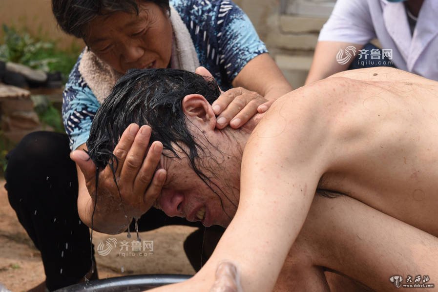 图为解锁后,母亲齐良英正在给吴强清洗身体。
