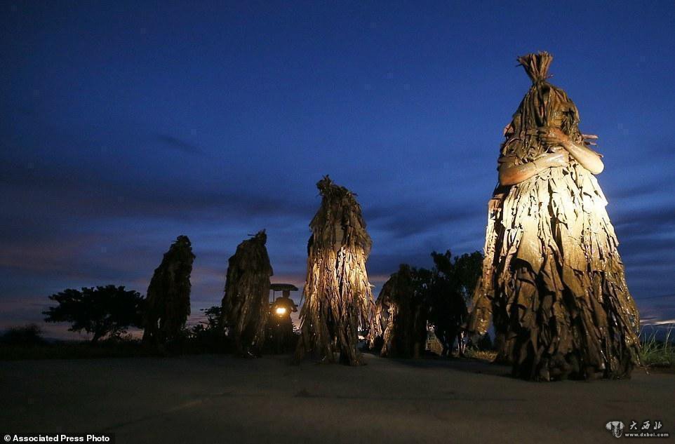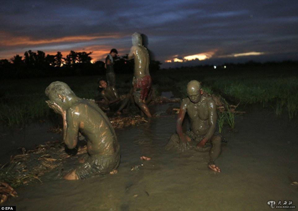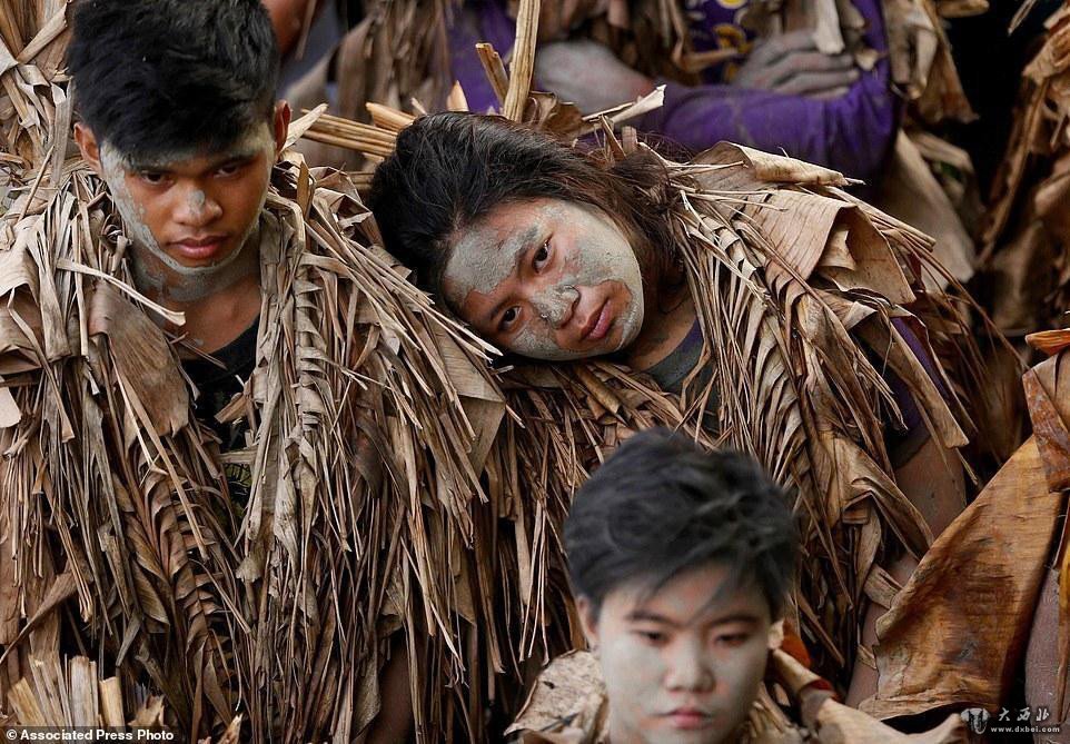 参加仪式前,这些裹着香蕉树叶的村民都会欢呼着在泥地里打滚。
