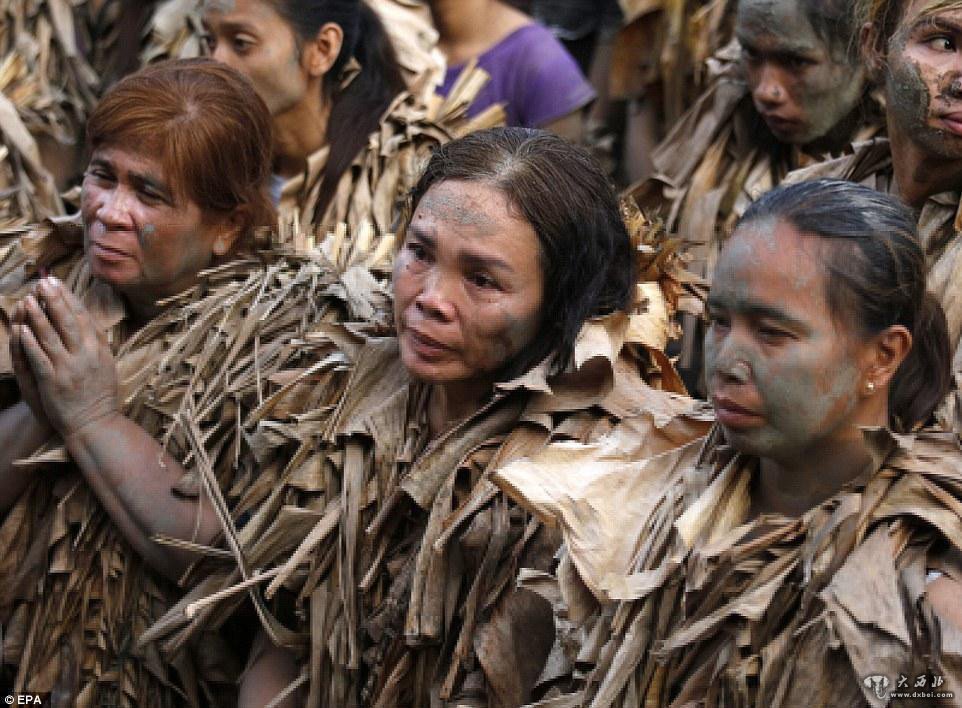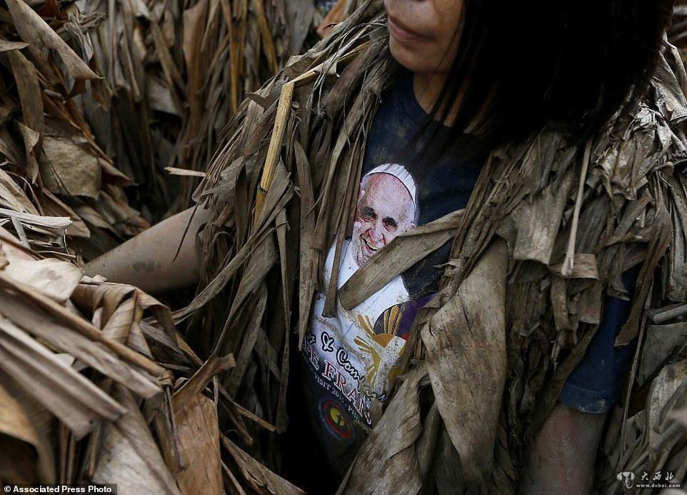 村民们裹着香蕉树叶,沾满烂泥向教堂走去。