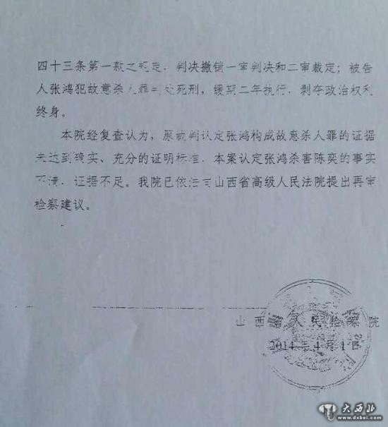 2012年,山西省检察院对张鸿故意杀人案进行复查,经过近两年调查,2014年4月作出《刑事申诉复查通知书》,认为案件事实不清、证据不足,并向山西高院提出再审检察建议。