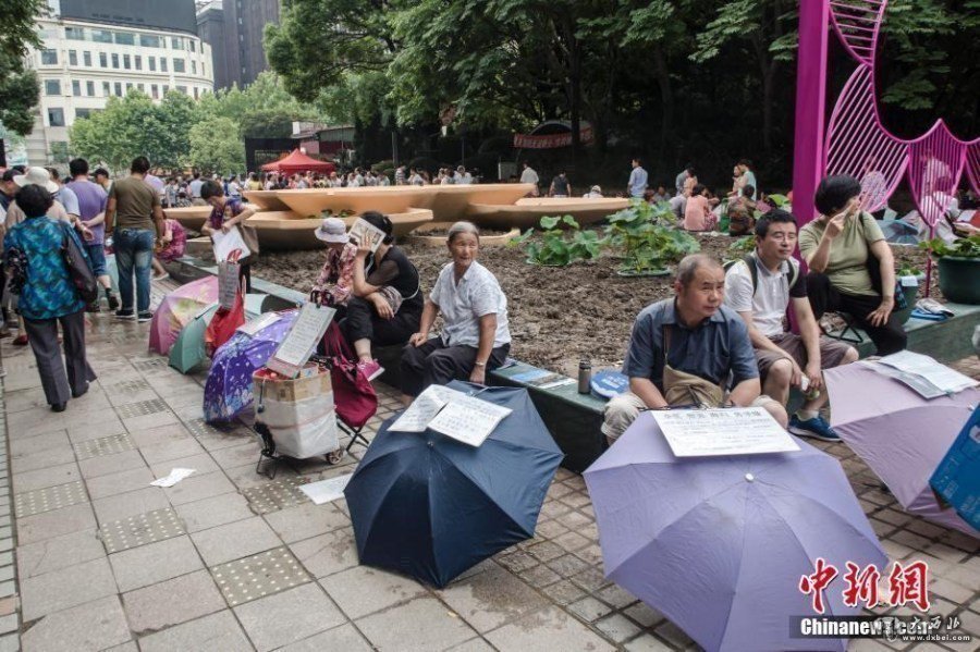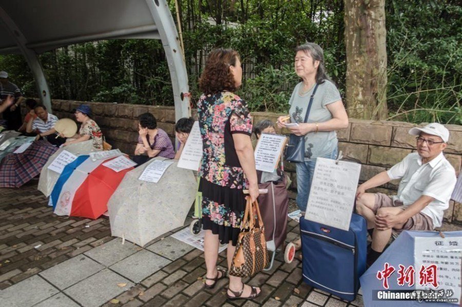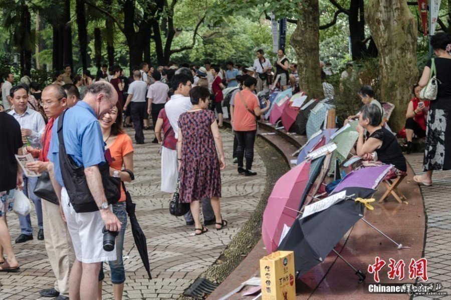 2016年7月3日,位于上海黄浦区人民广场内的相亲角内,聚集了大量为儿女寻觅“另一半”的家长。这些为儿女来此相亲的的父母,把一把把伞放在路边,贴上写有自己儿女相亲要求的纸条,遇到合适的家长就相互交流,互换联系方式。