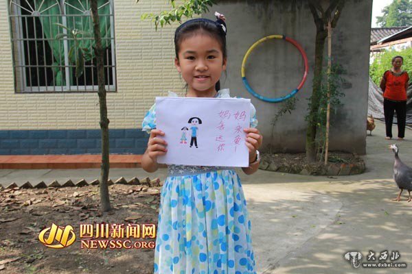 离开前,四川新闻网记者问江倩最想对妈妈说些什么,小姑娘歪着脑袋咬着嘴唇想了想:“我还是画张画吧。”在江倩的画里,一个小女孩和妈妈站在一起,脸上洋溢着幸福的笑容,旁边还写着一排字:妈妈 我永远爱你!