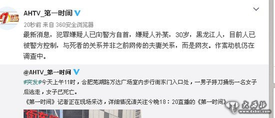 据合肥交通广播:[突发!芜湖路万达发生凶案]今天上午11点左右, 合肥市包河区万达广场东门出口发生一起凶杀案,一名年轻女子被一个短发黑衣男子持刀捅伤,后经确认这名女子已经死亡。案发后辖区警方第一时间控制现场,并迅速锁定犯罪嫌疑人,目前这名男子已经被警方控制,案件正在进一步的侦破中。