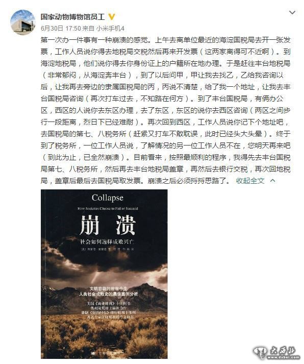 6月30日,名为“国家动物博物馆员工”的微博网友称,自己为交纳个税和开一张劳务发票,先后到北京的海淀国税局、海淀地税局、丰台地税局、丰台国税局、国税局第七税务所等5个单位,仍然无果而回。