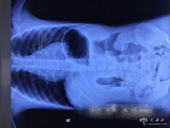 医生通过X光胸片在勇勇右腹部发现的针样金属物。