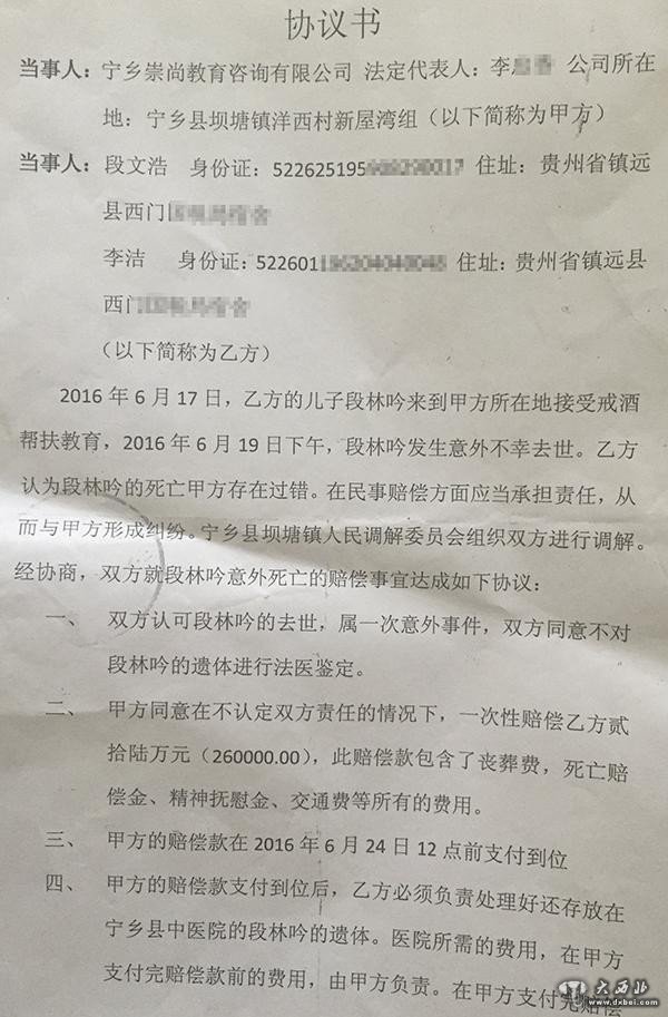 6月24日下午3点,家属与校方签订了赔偿协议(学校一次性赔偿家属26万)。段文浩说,在给遗体换衣服时,停尸房两名工作人员说,死者脖子骨头断裂。