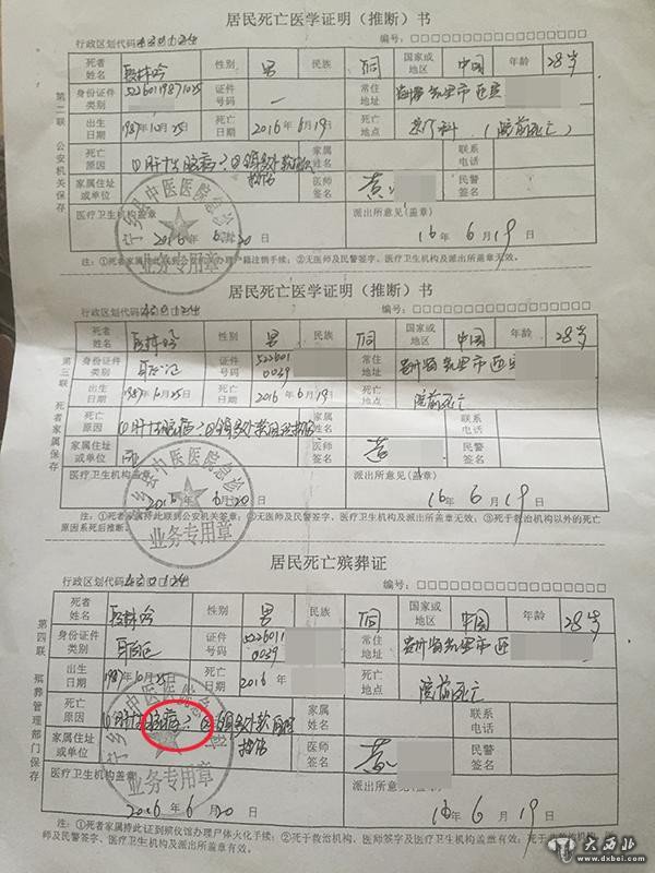 宁乡县中医院开具的居民死亡医学证明(推断)书中证实,段林吟属于院前死亡。死亡原因有两点,除了全身多处软组织挫伤外,还写有肝性脑病,但这一项打上了一个“?”。派出所意见一栏中,未见派出所的盖章。