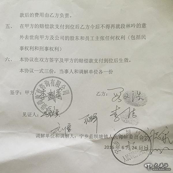 家属与学校签订的赔偿协议书。澎湃新闻记者 蒋格伟 图