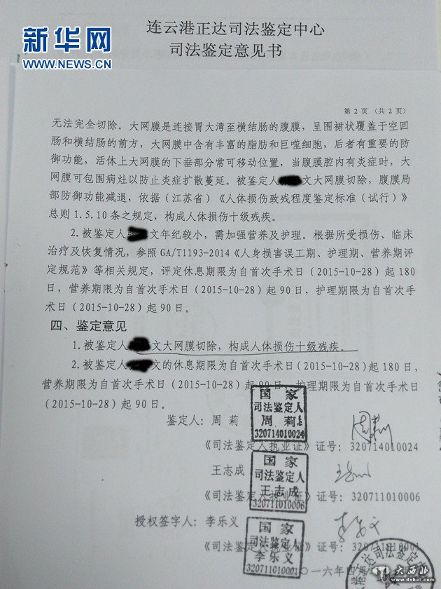 2016年3月24日,连云港正达司法鉴定中心经过严格的鉴定程序,依法出具鉴定意见书,认定连云港市妇幼保健院手术记录中没有记载畸胎瘤是否破裂、网膜腹壁等种植的情况及取结节送病理记录、如何取出肿物的过程等,存在手术记录不详细等病历书写不规范的医疗过错。同时,畸胎瘤手术对于肿瘤取出技巧要求高,避免破裂污染盆腔,需要用大量生理盐水或者葡萄糖水反复冲洗腹腔,避免发生化学性腹膜炎及盆腔种植,医院存在对卵巢畸胎瘤认识不足,未尽到高度注意义务的医疗过错。综合得出结论:连云港市妇幼保健院承担95%以上过错责任;文文后续治疗费用以实际发生费用为准。 2016年4月21日,该中心因患方申请,依法作出患者文文大网膜切除,构成人体损伤十级残疾的司法鉴定结论。