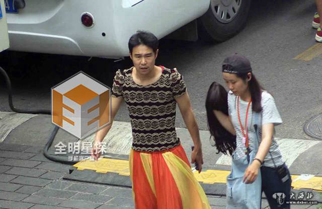 小沈阳身穿条纹上衣,而他的下身则是一条橘色长裙,看来小沈阳刚刚拍摄完男扮女装的片段。
