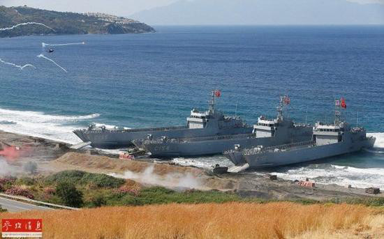 资料图:土耳其海军3艘坦克登陆舰冲滩登陆。