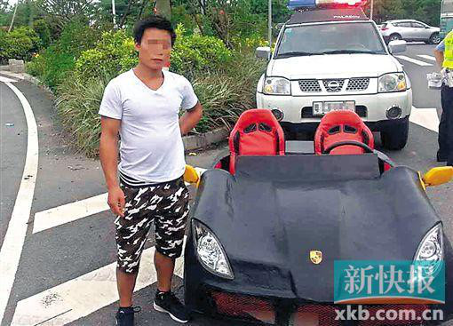 据珠海交警部门相关负责人介绍,7月14日下午6时多,金湾交警大队的韩警官正在珠海大道江珠高速路口巡查,突然发现一辆超级迷你敞篷跑车正由珠海大道东往西方向右转,准备进入江珠高速。远远看去,这辆跑车竟然没有车牌,而且车子外观简陋,比正常车辆要小很多,韩警官当即将该车拦下。