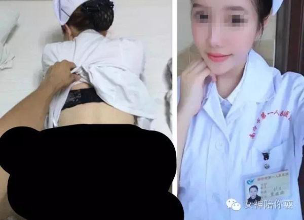 朋友圈流传的两张照片显示,一面容姣好的年轻女子头戴护士帽、身着印有“南宁市第一人民医院”字样的护士服,胸前工作证显示,其为南宁市第一人民医院护士覃某;另一照片中,一戴护士帽、身着护士服的女子下身赤裸,背对镜头俯身卧在疑似病床上与一男子作不雅举动。
