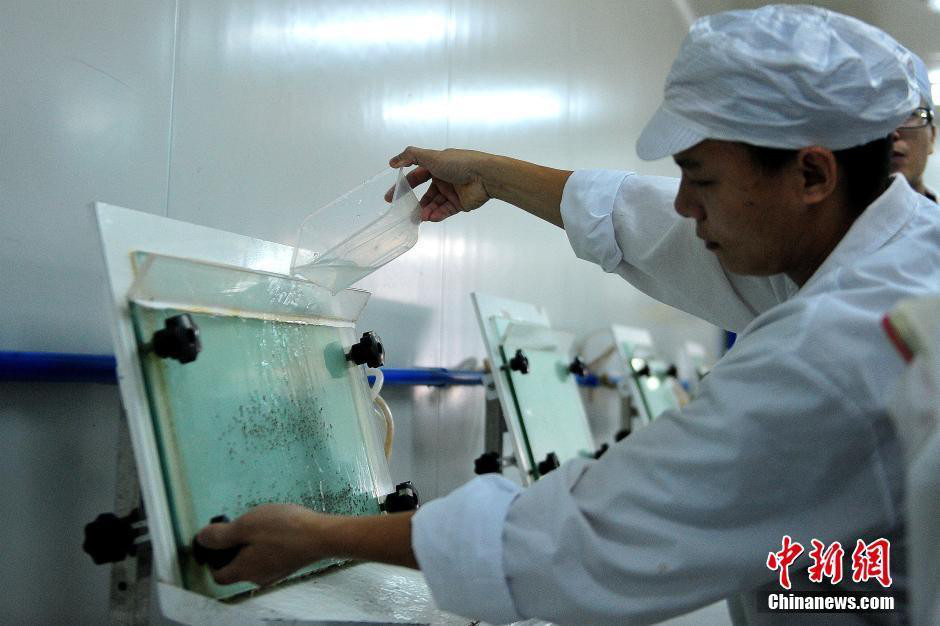 实验室科技人员将雌性和雄性蚊子幼虫分离。 中新社记者 黄卓贤 摄