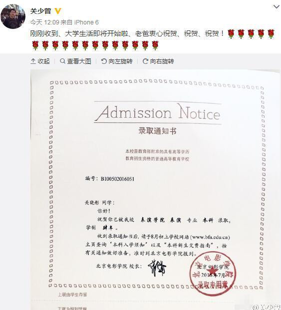 7月27日,关晓彤的父亲关少曾更新微博,晒出了女儿的北京电影学院的录取通知书,作为父亲的关少曾十分开心,他写道“刚刚收到、大学生活即将开始啦、老爸衷心祝贺、祝贺、祝贺!”