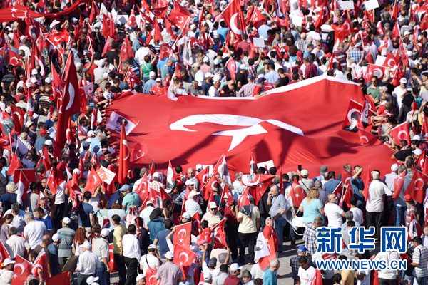 土耳其最大反对党和执政党7月24日在最大城市伊斯坦布尔联手举行大规模集会,反对本月15日夜发生的未遂军事政变。新华社记者贺灿铃摄