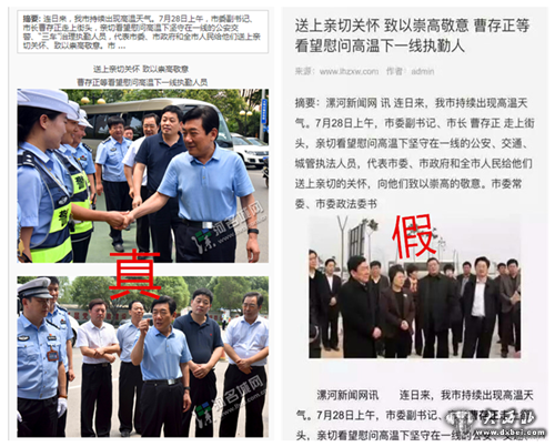 近日,漯河新闻网发布的一则关于漯河市领导看望慰问高温下坚守一线执法人员的新闻配图在网上引起热议。记者查证,该配图实为2013年3月该市相关领导视察舞阳县时的旧图,并非此次“高温慰问”的实际照片,漯河新闻网的图片系移花接木。
